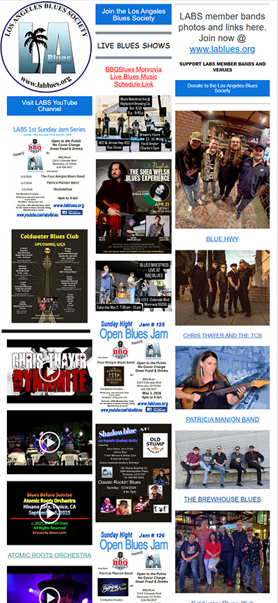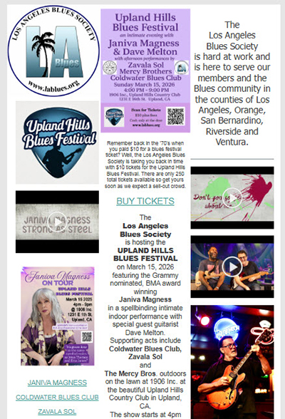 The Mission of The Los Angeles Blues Society is a dedication to preserving and perpetuating an array of Blues music forms in Los Angeles, and the greater area of Southern California. (Click HERE to read more)